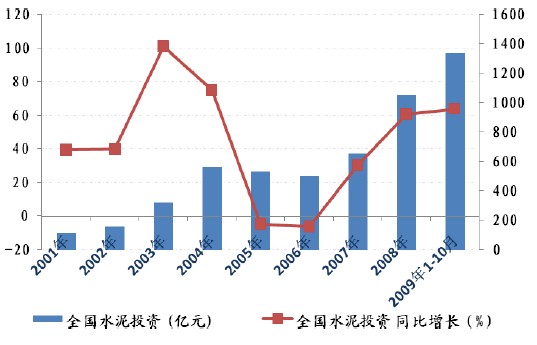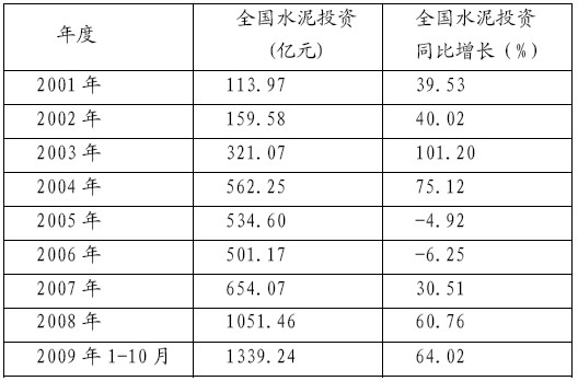 預計2010年水泥市場可能保持相對平衡的格局,局部的短缺和局部的過剩依然存在 一般水泥新增產(chǎn)能的建設周期為12-14個月。從表1及圖2可看到:2008年、2009年水泥固定資產(chǎn)投資增長均較快。有關(guān)信息顯示:2009年底我國新增水泥產(chǎn)能可能為2.6億噸左右,2009年我國淘汰落后水泥產(chǎn)能可能為6000——8000萬噸左右。據(jù)此估算,2009年底的實際新增水泥產(chǎn)能約為1.8億噸——2億噸。