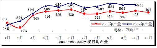 根據(jù)國家統(tǒng)計局?jǐn)?shù)據(jù),2009 年1-11 月份累計水泥產(chǎn)量14.93 億噸,同比增長19%,其中11 月當(dāng)月產(chǎn)量15096 萬噸,同比增長18%,日均產(chǎn)量環(huán)比下降0.23%。2009 年1-11 月份平板玻璃產(chǎn)量5.17 億重量箱,同比增長2.2%,其中11 月當(dāng)月產(chǎn)量4782.78 萬重量箱,同比增長6.4%,日均產(chǎn)量環(huán)比下降1.64%。