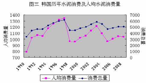 2008 年,我國(guó)人均水泥消費(fèi)量已突破1000 公斤,達(dá)到1040 公斤/人.年左右,預(yù)計(jì)2009年人均水泥消費(fèi)量有可能達(dá)到1200-1300 公斤/人.年。對(duì)于我國(guó)何時(shí)出現(xiàn)水泥消費(fèi)“拐點(diǎn)”,屆時(shí)水泥消費(fèi)總量、人均水泥消費(fèi)量能夠達(dá)到多少,是多年來國(guó)內(nèi)各機(jī)構(gòu)、專家一直試圖解開的謎底,雖然做了大量的工作,可惜自“九五”至今都沒能做出準(zhǔn)確預(yù)測(cè)。筆者也沒有能力預(yù)測(cè)所謂的“拐點(diǎn)消費(fèi)量”及由“拐點(diǎn)”回落進(jìn)入平穩(wěn)消費(fèi)期后的人均水泥消費(fèi)量。但筆者一直認(rèn)為研究在文化、生活方式等方面與我國(guó)大陸相近的日本、我國(guó)臺(tái)灣、韓國(guó)的水泥消費(fèi)趨勢(shì),對(duì)研究我國(guó)水泥消費(fèi)具有一定的借鑒意義。
