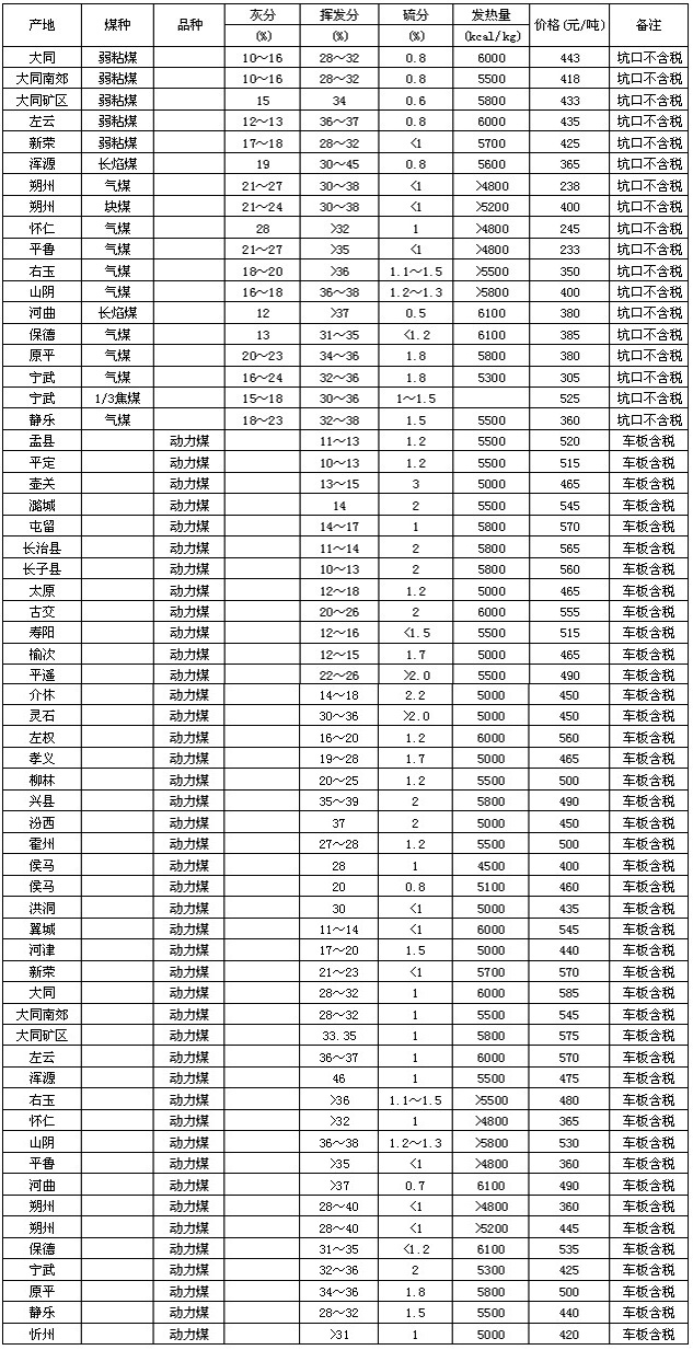 12月31日山西省其他煤種價格行情