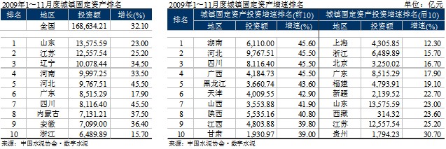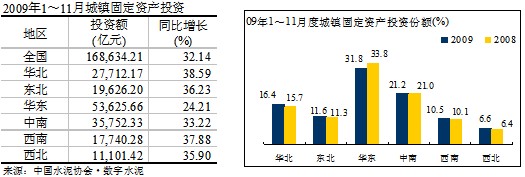2009年1~11月,全國(guó)累計(jì)完成城鎮(zhèn)固定資產(chǎn)投資168,634.21億元,同比增長(zhǎng)32.14%,比去年同期依然提高了5.3個(gè)百分點(diǎn)。