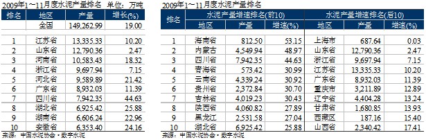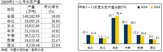 1~11月份,水泥市場(chǎng)逐漸見(jiàn)旺,產(chǎn)量以較高的速度增長(zhǎng),全國(guó)水泥產(chǎn)量14.93億噸,同比增長(zhǎng)19%,增幅比去年同期提高了13.3個(gè)百分點(diǎn)。預(yù)計(jì)09年全年產(chǎn)量約16.4億噸,比08年約增加2.4億噸,同比增長(zhǎng)約為17%。