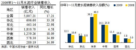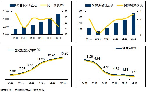 2009年1~11月,水泥市場(chǎng)在高需求的環(huán)境下,使得去年釋放的2億噸水泥產(chǎn)量基本消化,帶動(dòng)了各項(xiàng)經(jīng)濟(jì)指標(biāo)的提高:除銷售收入的增速低于去年外,利潤(rùn)、銷售利潤(rùn)率、應(yīng)收賬款周轉(zhuǎn)率、積壓率等各項(xiàng)指標(biāo)都不同程度的優(yōu)于去年。但在各個(gè)區(qū)域之間表現(xiàn)不一,分化明顯。