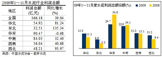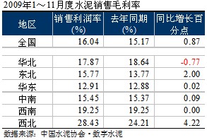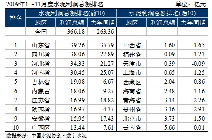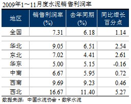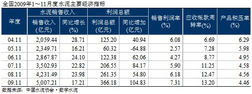 在摸索中奮進(jìn),種種迷霧和不確定性逐漸明朗。1~11月份數(shù)據(jù)顯示,盡管2009年產(chǎn)能釋放壓力前所未有,但在國(guó)家拉動(dòng)經(jīng)濟(jì)政策下,水泥需求超預(yù)期,拉動(dòng)水泥利潤(rùn)總額、銷售利潤(rùn)都高于去年水平。