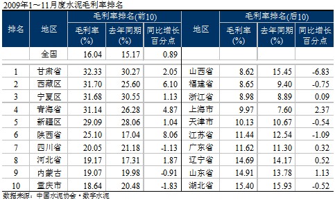 從發(fā)布數(shù)據(jù)看,西北、西南地區(qū)毛利率表現(xiàn)依然要好于其他地區(qū)。前10中,西北5省區(qū)全部入圍,西南除云南、貴州外也皆在其中,內(nèi)蒙古也列入排名在前10之內(nèi)。陜西毛利率提高了8.06個(gè)百分點(diǎn),達(dá)到了25.1%,大大好于去年。西部地區(qū)的良好表現(xiàn),使全國(guó)的毛利率穩(wěn)固上升,拉升了全國(guó)的水泥市場(chǎng)。