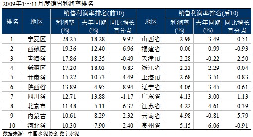 銷售利潤(rùn)率排名前10基本上都為的主要是西北、西南地區(qū)的省份,其中寧夏利潤(rùn)率最高,達(dá)到了28.25%;排名前十中的青海、新疆、四川,利潤(rùn)率出現(xiàn)下滑。山西省的利潤(rùn)率為負(fù),但比去年同期增長(zhǎng)了0.51個(gè)百分點(diǎn)。