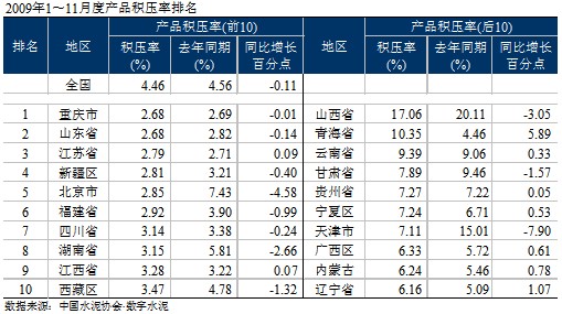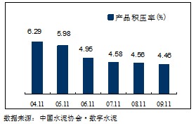 在水泥產(chǎn)量大幅增長(zhǎng)的背景下,1~11月的全國(guó)水泥產(chǎn)品積壓率仍延續(xù)了近幾年連續(xù)下降的趨勢(shì),為6.07%。產(chǎn)品積壓率下降的原因,主要原因是,市場(chǎng)需求好于預(yù)期,西北、西南局部地區(qū)還出現(xiàn)供不應(yīng)求;而華東地區(qū)為四季度旺季提價(jià)做準(zhǔn)備,持續(xù)減少產(chǎn)品庫(kù)存。
