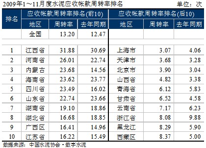 應(yīng)收賬款周轉(zhuǎn)率前10的地區(qū)均在16次以上,其中江西達(dá)到了30次以上,河南、內(nèi)蒙古、海南、四川、山東達(dá)到了20次以上,較1~8月有了明顯提高;天津、北京、上海三大直轄市回款依然不佳。
