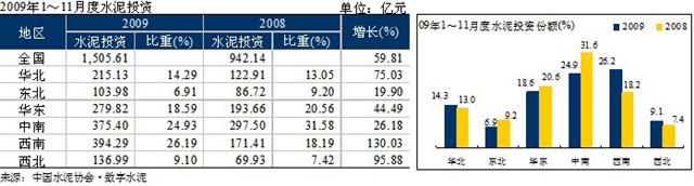 在擴(kuò)內(nèi)需政策的拉動(dòng)下,需求快速增長(zhǎng),利潤(rùn)水平增長(zhǎng),拉動(dòng)水泥投資持續(xù)火熱: 1~11月全國(guó)水泥投資1,505.61億元,同比增長(zhǎng)59.8%,與去年同期持平,但仍處于高位增長(zhǎng)區(qū)間。預(yù)計(jì)2009年全年水泥投資約1,650~1,700億元,投資額比2008年約增加600~650億元。
