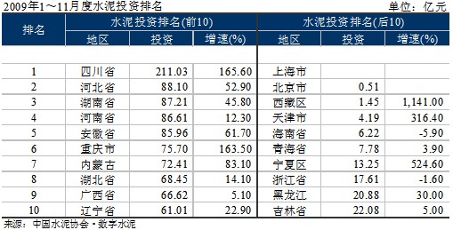 投資前10的。▍^(qū)、市)主要來(lái)自中南、西南地區(qū),政府西部開發(fā)的傾向與經(jīng)濟(jì)發(fā)展的偏移,也是西部水泥高投資的原因。其中四川地區(qū)受災(zāi)后重建拉動(dòng),水泥投資額與水泥投資增速均高居全國(guó)第一,投資額為211.03億元,同比增長(zhǎng)165.6%。