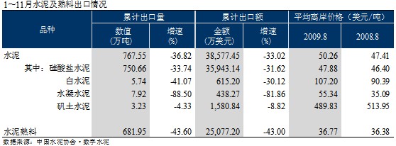 受全球金融危機(jī)的影響,2009年水泥出口依然持續(xù)下滑。1~11月水泥出口量為767.55萬(wàn)噸,同比下降36.82%;水泥熟料出口量為681.95萬(wàn)噸,同比下降43.60%。水泥和熟料的離岸價(jià)格都有增長(zhǎng),達(dá)到了每噸50.26美元和36.77美元。