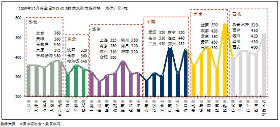 受原材料價(jià)格下降和產(chǎn)能充分釋放等因素的影響,2009年全國(guó)水泥價(jià)格平均價(jià)格較去年有所下降。截止12月,統(tǒng)計(jì)的31省市中: