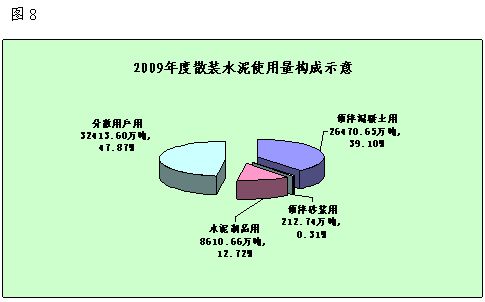 2009年全國散裝水泥使用量為67707.65萬噸(不含出口和中轉(zhuǎn)儲存環(huán)節(jié)的數(shù)量),比去年同期增加7309.19萬噸。其中:預(yù)拌混凝土使用量為26470.65萬噸,增加4242.84萬噸;預(yù)拌砂漿使用212.74萬噸,增加127.33萬噸;水泥制品使用8610.66萬噸,減少 2233.8萬噸;分散用戶使用32413.6萬噸,增加5203.66萬噸;增長率分別為19.09%、149.08%、-20.6%和19.12%。