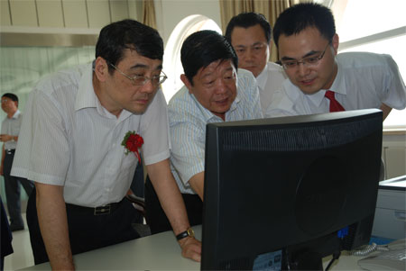 7月15日,在榆樹井煤礦調(diào)度室,國家煙草專賣局副局長李克明,臨礦集團董事長、黨委書記李義文,中國雙維投資公司總經(jīng)理吳建明(自左至右)在監(jiān)視屏前觀察煤炭生產(chǎn)運行情況。