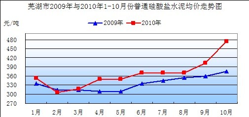 從上面的水泥的零售價格統(tǒng)計表和走勢圖,可以清晰的看到,十月份蕪湖市水泥的零售價格出現(xiàn)較大幅度的上漲,其中當(dāng)前市場上銷售的普通硅酸鹽水泥(袋裝)32.5強度和42.5強度的價格分別為445元/噸和505元/噸。與上月相比,環(huán)比漲幅為21.92%和18.82%,同比則分別出現(xiàn)了27.14%和26.25%的漲幅。