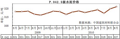 據(jù)統(tǒng)計(jì),9 月份重點(diǎn)聯(lián)系水泥企業(yè)42.5 級(jí)普通硅酸鹽水泥平均價(jià)格為326.61 元/噸,環(huán)比增長0.74%,同比增長3.08%。