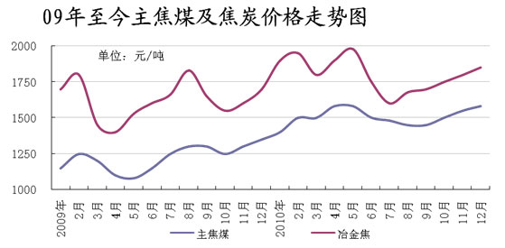 圖1:2009-2010年12月山西主焦煤及焦炭月度價(jià)格示意圖