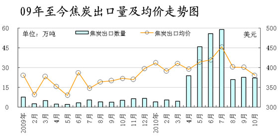 圖4:2009-2010年10月焦炭月度出口量及均價(jià)走勢(shì)圖