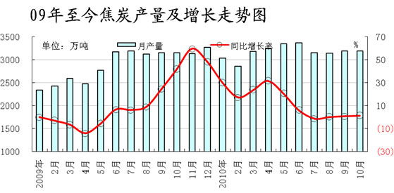 據(jù)統(tǒng)計(jì)局?jǐn)?shù)據(jù)顯示:2010年10月份中國(guó)共生產(chǎn)焦炭3,196.3萬(wàn)噸,比去年同期增加42.6萬(wàn)噸,同比增加 1.4%。中國(guó)1-10月焦炭總產(chǎn)量為32027.7萬(wàn)噸,累計(jì)比去年同期增加3333.6 萬(wàn)噸,累計(jì)同比增長(zhǎng)11.6%。1-10月份國(guó)有重點(diǎn)煤礦煤炭產(chǎn)量14.31億噸,累計(jì)同比增長(zhǎng)16.7%。1-10月份粗鋼產(chǎn)量達(dá)到5.25億噸。