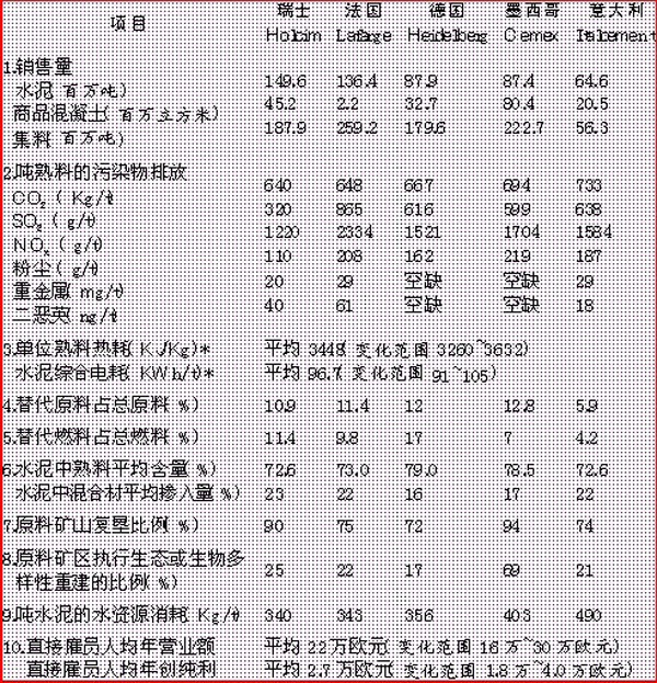 注:上表列舉了2007年國際五大水泥公司的一些重要運(yùn)營指標(biāo),相當(dāng)于國際中等稍偏上水平,并非國際先進(jìn)水平。