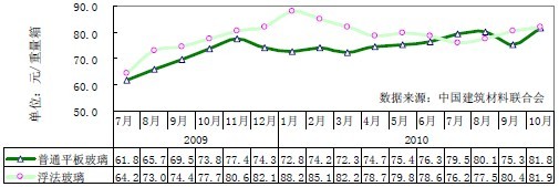 浮法玻璃價(jià)格繼續(xù)上漲。據(jù)統(tǒng)計(jì),10 月份重點(diǎn)聯(lián)系玻璃企業(yè)浮法玻璃平均價(jià)格為81.9元/重量箱,環(huán)比增長(zhǎng)1.9%,同比漲幅為5.4%;普通平板玻璃價(jià)格快速回升,10 月份平均價(jià)格為81.8 元/重量箱,環(huán)比上升8.7%,同比增幅10.8%。