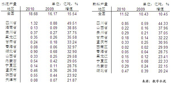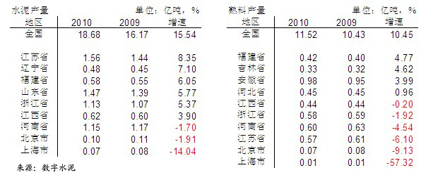 2010年全國(guó)水泥產(chǎn)量增速繼續(xù)保持高增長(zhǎng),增速低于10%的有9個(gè)省市,除河南、江西外,均在東部地區(qū),其中有4個(gè)省產(chǎn)量在1億噸以上,受世博會(huì)影響,上海下跌幅度最大。