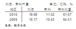 2010年生產(chǎn)熟料11.52億噸,熟料占水泥產(chǎn)量比重61.67%,比去年下降了近3個(gè)百分點(diǎn)。
