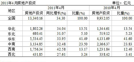 2011年1~4月份,全國(guó)累計(jì)房地產(chǎn)投資額13,340億元,同比增長(zhǎng)34%,房地產(chǎn)投資繼續(xù)保持較快增長(zhǎng)。