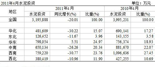 在國(guó)家對(duì)新建產(chǎn)能的嚴(yán)卡下,水泥投資增長(zhǎng)繼續(xù)回落,2011年4月份全國(guó)水泥累計(jì)投資319億元,同比負(fù)增長(zhǎng)20%。