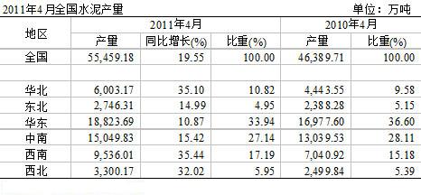 2011年4月份水泥產(chǎn)量5.5億噸,同比增速19.55%。遠(yuǎn)超預(yù)期,從各大區(qū)來(lái)看,西南,華北、西北增長(zhǎng)均超過(guò)30%,其余地區(qū)也超過(guò)2位數(shù)增長(zhǎng),說(shuō)明1~4月份的水泥市場(chǎng)形式依舊保持旺盛。