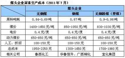 尿素本身屬于資源類產(chǎn)品,生產(chǎn)工藝分煤炭型和天燃?xì)庑蛢煞N,石油制尿素法由于其成本偏高已被業(yè)內(nèi)淘汰。尿素生產(chǎn)中,原料方面至少要占全成本的80%左右。因此,煤炭以及天然氣價(jià)格便是尿素價(jià)格的風(fēng)向標(biāo)。目前,全國(guó)有超過(guò)72%以上的尿素生產(chǎn)企業(yè)以煤為原料。所以,這部分廠家的生產(chǎn)成本可以看成業(yè)內(nèi)標(biāo)桿。下表所示為截止到2011年7月,煤頭企業(yè)的生產(chǎn)成本數(shù)據(jù)(僅供參考)。這些工廠主要分布于華北、華東以及華中地區(qū),也正好是我國(guó)尿素主產(chǎn)區(qū)。