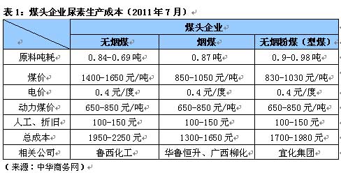 表1分別從無(wú)煙煤(小塊、中快、大塊)、煙煤以及無(wú)煙粉煤把煤頭尿素企業(yè)分為三類(lèi)。從結(jié)果可以看出:使用無(wú)煙塊煤為原料的企業(yè)每噸尿素成本控制在1950-2250元/噸,有些甚至更高;無(wú)煙粉煤略低為1700-1980元/噸。當(dāng)然,這些成本核算是在晉煤在7月將無(wú)煙煤價(jià)格上調(diào)30-50元之后所得出的結(jié)果。表中可以看出:使用煙煤的成本最低,但由于大面積推廣煙煤技術(shù)有一定難度,所以這部分企業(yè)所占比例極小。絕大多數(shù)的尿素企業(yè)還是那些高成本工藝,且要占到全國(guó)煤頭企業(yè)的60%以上。