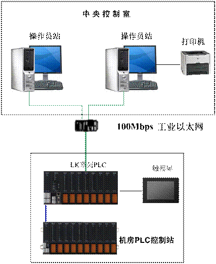 系統(tǒng)主要以北京和利時(shí)公司LK系列PLC為核心、執(zhí)行機(jī)構(gòu)、聲控報(bào)警、儀表系統(tǒng)等組成,主要控制26個(gè)不同儲(chǔ)罐的溫度、液位、流量等,還包括13臺(tái)泵及9臺(tái)開(kāi)關(guān)閥的控制,所有儲(chǔ)罐均設(shè)置液位高低限報(bào)警、溫度報(bào)警、流量控制。在中央控制室設(shè)置操作員站和工程師站,并聯(lián)網(wǎng)至總控室,方便人員對(duì)整廠的系統(tǒng)監(jiān)控與管理,硬件結(jié)構(gòu)示意圖如圖3-1所示。