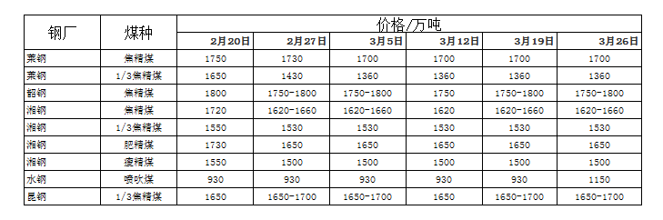 上游方面:三月份國內(nèi)煉焦煤弱勢盤整,多以維穩(wěn)為主,山西柳林焦煤G85V21S0.5A9車板含稅1620元/噸,鄉(xiāng)寧焦煤G60-70V16-20S0.5A10車板含稅1600元/噸,靈石肥煤G90S30-36S0.6A15-17坑口含稅990元/噸;河北唐山焦煤G80V23-25S1A10Y20出廠含稅1600元/噸;黑龍江七臺河肥煤G100V30S0.3A10Y27車板含稅1630元/噸;山東棗莊1/3焦煤G72V38S0.8A8車板含稅1380元/噸;烏海1/3焦煤G83V30S1.1A11Y20出廠含稅1050元/噸;六盤水焦煤G79V25.3S0.6A10Y20出廠含稅1580元/噸。下個下降空間有限,波動空間逐漸縮小。