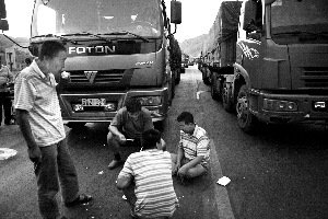 京藏高速內(nèi)蒙古興和至河北省懷安段堵車已達(dá)3天。昨日,一些司機(jī)席地而坐,邊吃飯邊等待路通。