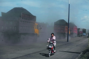 萬全縣境內(nèi)的大貨車掀起的灰塵令行人呼吸困難。