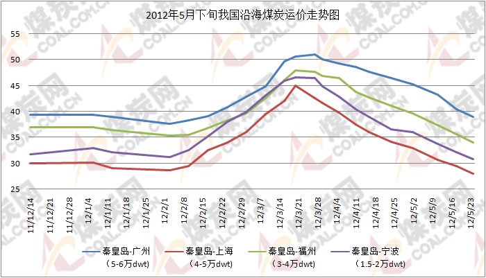 本周,我國(guó)沿海煤炭海運(yùn)費(fèi)仍舊繼續(xù)下行,甚至部分航線運(yùn)費(fèi)已跌至今年以來最低值。據(jù)煤炭網(wǎng)信息研究中心數(shù)據(jù)顯示,截止到5月24日,秦皇島-廣州(5-6萬DWT)運(yùn)價(jià)39元/噸,較上期相比下跌1.4元;秦皇島-福州(3-4萬DWT)運(yùn)價(jià)34元/噸,較上期相比下跌1.6元;秦皇島-寧波(3-4萬DWT)運(yùn)價(jià)30.8元/噸,較上期相比下跌1.3元;天津-上海(2-3萬DWT)運(yùn)價(jià)29.2元/噸,較上期相比下跌1.9元;京唐/曹妃甸-寧波(4-5萬DWT)運(yùn)價(jià)28.1元/噸,較上期相比下跌2元;黃驊-上海(3-4萬DWT)運(yùn)價(jià)27.9元/噸,較上期相比下跌2.2元;秦皇島-上海(4-5萬DWT)運(yùn)價(jià)28元/噸,較上期相比下跌1.5元,已降至今年以來最低值。