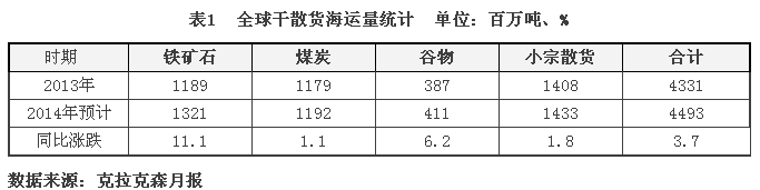 今年全球經(jīng)濟復(fù)蘇仍將是脆弱和不平衡的。烏克蘭地緣政治危機將對歐洲經(jīng)濟造成沖擊,國際油價大幅回落,俄羅斯經(jīng)濟也面臨下行壓力。國際貨幣基金組織預(yù)計今年全球經(jīng)濟增速為3.8%,國際干散貨海運貿(mào)易量增幅繼續(xù)收窄?死松A(yù)計,今年全球干散貨海運量為46.59億噸,同比增長3.7%(見表3)。