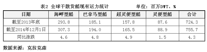 去年全球干散貨運力增幅繼續(xù)收窄,截至12月1日,全球干散貨運力共計7.56億DWT,較年初增長4.3%,增幅同比下滑1.1個百分點。其中,海岬型船運力3.07億DWT,較年初增長4.76%,增速同比持平;巴拿馬型船運力1.94億DWT,較年初增長4.8%,增幅同比下滑3.7個百分點;超靈便型船運力1.66億DWT,較年初增長4.9%,增幅同比下滑1.8個百分點(見表2)。