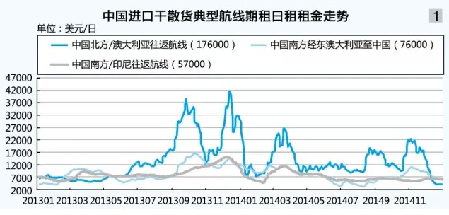 去年海岬型船市場運價呈波浪式震蕩,振幅縮小。全年走出三波上漲行情,上半年在礦商加快出貨步伐以及市場炒作影響下,一改2013年低位平穩(wěn)運行走勢,2月下旬至3月下旬海岬型船日租金大幅上漲。下半年,鐵礦石價格持續(xù)下跌,8月中旬至9月中旬、10月下旬至11月中旬,鐵礦石船運活動升溫,與2013年一樣走出兩輪上漲行情,但上漲幅度小,持續(xù)時間短。隨著國際油價大幅回落,中國經(jīng)濟放緩,海岬型船提早進入低迷慘淡行情,日租金跌至2013年以來最低。去年年底,中國北方至澳大利亞往返航線日租金為4050美元,較年初下跌85.9%;全年平均13138美元,同比下跌9.3%。