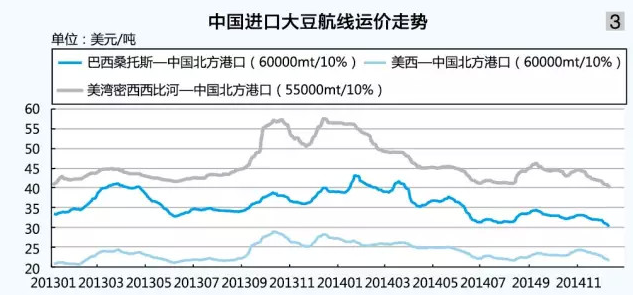 糧食航線:上半年,南美二季度糧食出口季節(jié),市場運價尚能同比持平,但下半年,煤炭船運減少,大西洋市場運力增加,油價下滑,美灣至中國北方港口糧食運價同比明顯下降。去年年底,巴西桑托斯至中國北方港口大豆航線運價為26.740美元/噸,較年初下跌31.5%,全年平均34.896美元/噸,同比下跌4.4%;美灣至中國北方港口航線運價為35.811美元/噸,較年初下跌36.8%,全年平均45.293美元/噸,同比下跌2.7%(見圖3)。