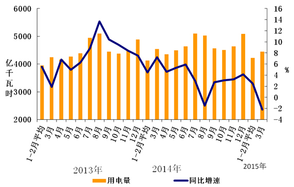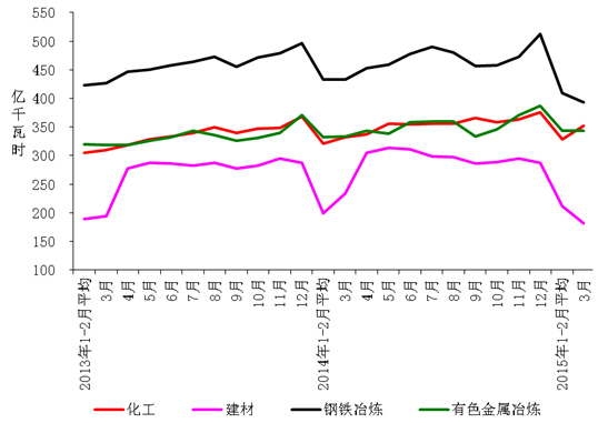 1-3月份,化學(xué)原料制品、非金屬礦物制品、黑色金屬冶煉、有色金屬冶煉四大高載能行業(yè)用電量合計3856億千瓦時,同比下降 1.3%,增速比上年同期回落5.5個百分點;合計用電量占全社會用電量的比重為29.9%,對全社會用電量增長的貢獻率為-48.1%。其中,化工行業(yè)用電量1009億千瓦時,同比增長3.6%,增速比上年同期回落0.1個百分點;建材行業(yè)用電量606億千瓦時,同比下降4.4%,增速比上年同期回落15.1個百分點;黑色金屬冶煉行業(yè)用電量1212億千瓦時,同比下降6.8%;增速比上年同期回落8.5個百分點;有色金屬冶煉行業(yè)1029億千瓦時,同比增長3.0%,增速比上年同期回落1.1個百分點。