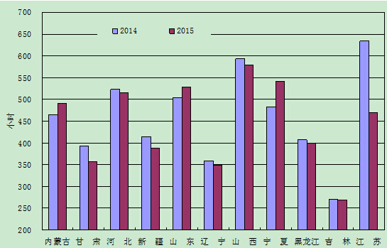 分類型看,1-3月份,全國水電設(shè)備平均利用小時609小時,同比提高58小時;水電裝機容量超過1000萬千瓦的7個省份中,青海、云南同比分別下降58小時、55小時,四川基本持平,貴州、廣西同比分別提高354小時、349小時。全國火電設(shè)備平均利用小時1106小時,同比下降122小時,降幅比2014年同期擴大120小時;其中青海1601小時,寧夏、海南、江蘇、陜西、江西、新疆、河北超過1200小時;云南和西藏火電設(shè)備利用小時低于500小時,分別為497小時和40小時 ;與上年同期相比,共有26個省份火電利用小時同比下降,其中,重慶、四川、北京和廣西下降超過300小時。全國核電設(shè)備平均利用小時1638小時,同比下降202小時。全國風電設(shè)備平均利用小時483小時,同比上升4小時,其中江蘇、上海和貴州下降顯著,同比分別下降164小時、135小時和122小時。