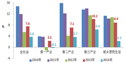 圖1 2010-2014年全社會及各產(chǎn)業(yè)用電量增長情況圖