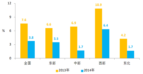 圖2 2013、2014年各地區(qū)用電量增長情況圖