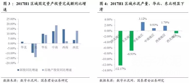 2017年上半年全國水泥產(chǎn)量僅0.4%的增長,基本維持穩(wěn)定。但從區(qū)域看,房地產(chǎn)需求景氣,華東、中南、西南水泥產(chǎn)量增速依然維持1.5%-3%的正增長;而基建需求占比較高的東北、華北水泥產(chǎn)量(產(chǎn)量表征需求)出現(xiàn)斷崖下跌(該區(qū)域并非第一年明顯下降)。