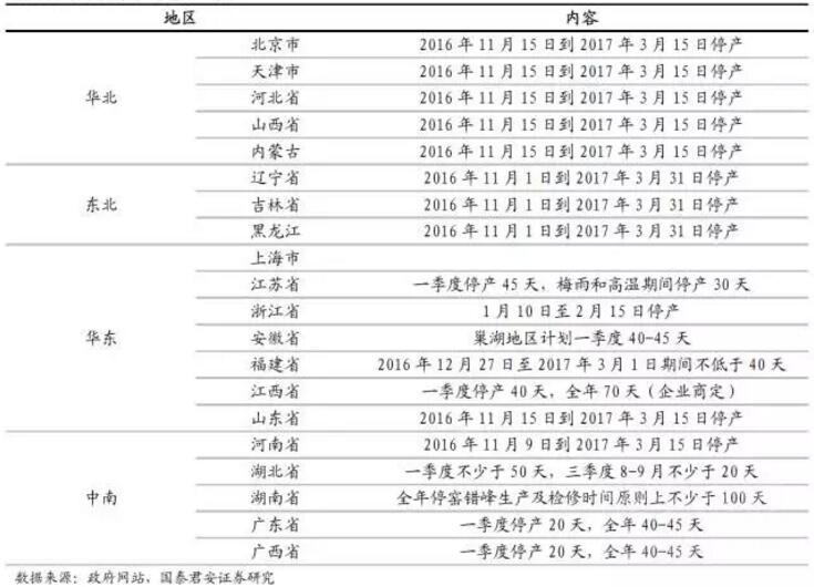 2017年上半年看,環(huán)保、錯峰生產(chǎn),全國各主要省份均出臺的相應的錯峰停產(chǎn)停窯限產(chǎn)的計劃, 2017年停窯計劃時間明顯超過行業(yè)慣例(平均每年停窯55天左右)。而考慮到今年是《大氣污染防治行動計劃》考核年,今年錯峰停產(chǎn)可能高于16年標準。