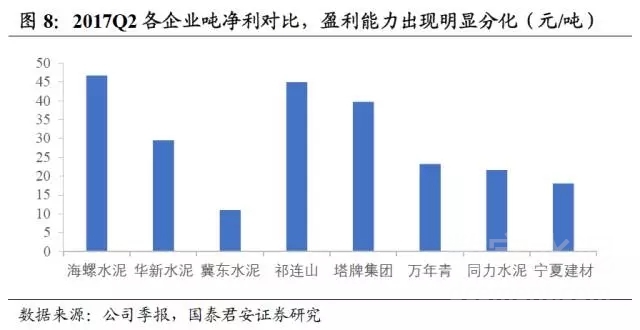噸凈利看,龍頭海螺水泥Q2為47元/噸,西北的祁連山為45元/噸(主要是成本煤炭較低,噸毛利高導致),華南的塔牌集團為40元/噸,而華北的冀東水泥,西北的寧夏建材噸凈利為11元/噸、18元/噸。