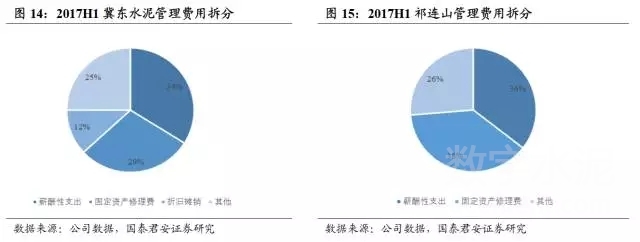 對比受錯峰停產(chǎn)政策影響的華北、西北企業(yè)看,冀東水泥、同力水泥、祁連山、寧夏建材噸三費均在40元/噸以上。以冀東為例,上半年銷量同比下滑19%,導致管理費用中固定資產(chǎn)折舊及停產(chǎn)停窯修理費占比超過40%;祁連山修理費占比也接近40%,而對比海螺、塔牌兩家企業(yè),修理折舊占比分別為13%、23%。