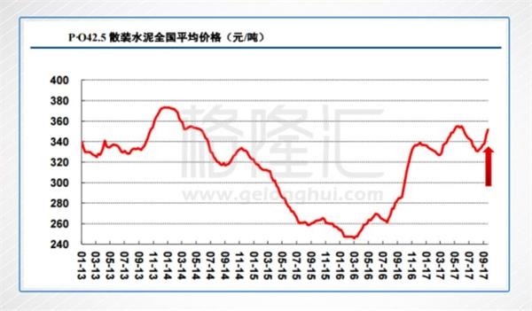 全國有20個省市自治區(qū)的P.O42.5散裝水泥價格環(huán)比上漲,水泥價格也正式步入新一波的升軌(上圖紅箭頭所示)。